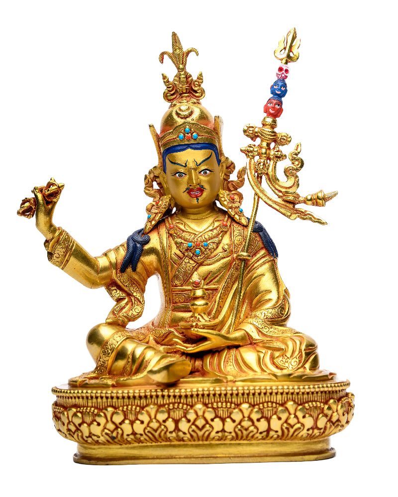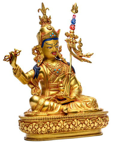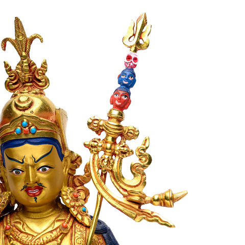 This magnificent Guru Rinpoche statue is meticulously handcrafted from copper and adorned with a radiant 24k gold plating, reflecting exceptional artistry and devotion.