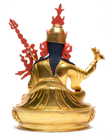 This magnificent Guru Rinpoche statue is meticulously handcrafted from copper and adorned with a radiant 24k gold plating, reflecting exceptional artistry and devotion.